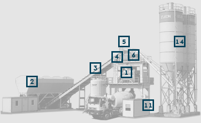 Бетонный завод ELKOMIX 135 оснащен рядными бункерами для инертных материалов объемом 4х30 м³. Загрузка материалов производится с одного пандуса, что экономит полезное пространство на площадке. Подача материалов из бункеров в смеситель производится транспортерной лентой. Данный завод оборудован бункером-накопителем, таким образом отдозированный материал собирается в нем и ожидает окончания процесса смешивания. Данный узел позволяет сократить циклограмму, уменьшив период дозирования инертных материалов, который начинается сразу после начала смешивания компонентов в смесителе.